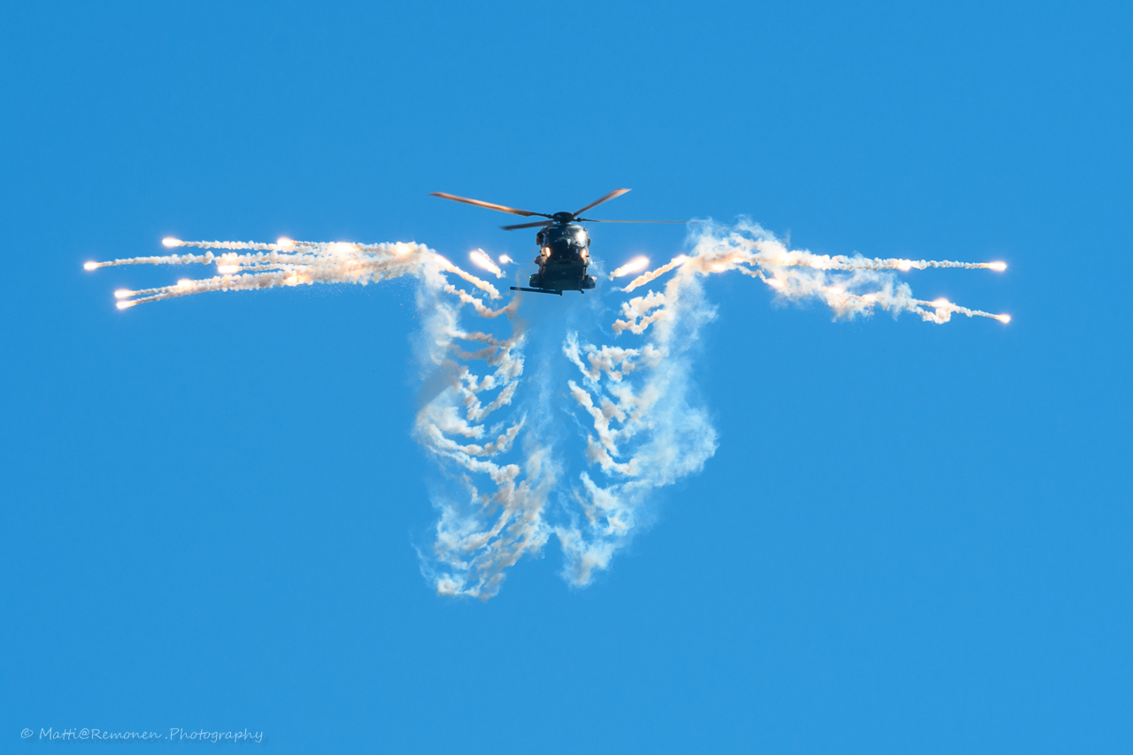 Seuraavaksi paikalle tulikin vanha tuttavamme NH90 ja samat kuviot kuin viikko sitten. Joka oli sinänsä hyvä, että nyt osasi hieman ennakoida, että mitä tuleman pitää. Ysikymppisen perään tulivat sitten Phil Lawtonin VL Viima, taitolentoryhmä Arctic Eagles ja DC-3. Siinä välissä helikopterikin teki uuden vierailun yleisön keskelle. Kenenkähän idea tämä oikein on ollut?