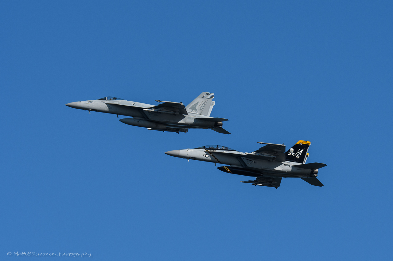 Finskin perään piti sitten päästä itse asiaan ja paikalle oli kutsuttu Yhdysvaltain merivoimien kaksi Super Hornet -hävittäjää. Valitettavasti vain niiden ”show” oli varsinainen antikliimaksi. Jotenkin ymmärtää, että DC-3 ja A350 lentävät arvokkaasti oikealta vasemmalle ja sitten vasemmalta oikealle. Mutta että Super Hornetit… siis pliis, näilläkö meidän tulee ryssä pitää loitolla? No, ehkä Volodja tikahtuu nauruun ja putoaa taivaalta nähdessään näiden neitien söpön kaartelun. Ei jatkoon. Tosin plussana se, että pojilla näytti olevan siipien alla muutakin kuin lisäpolttoainetankit. Että josko sittenkin…?