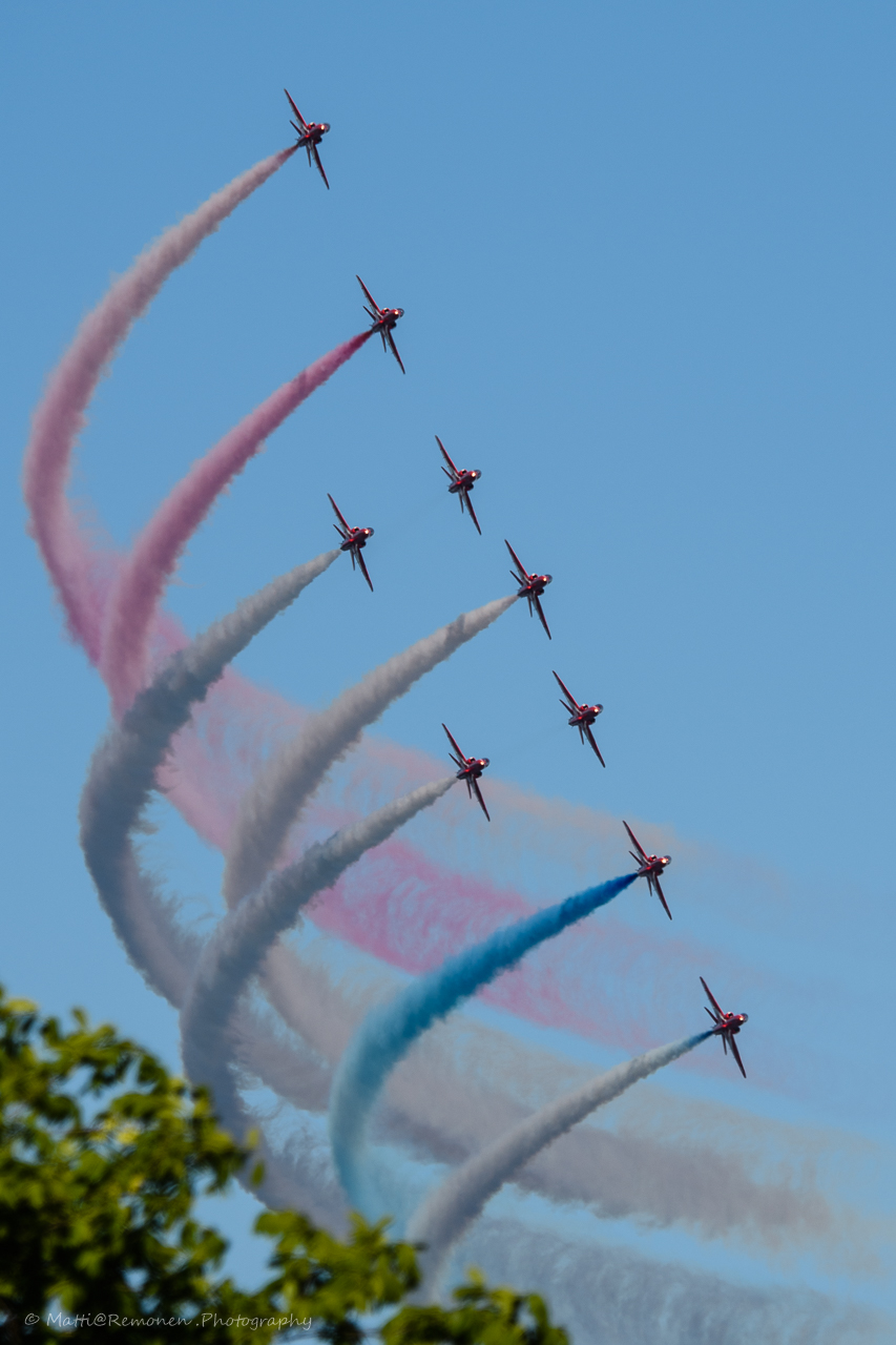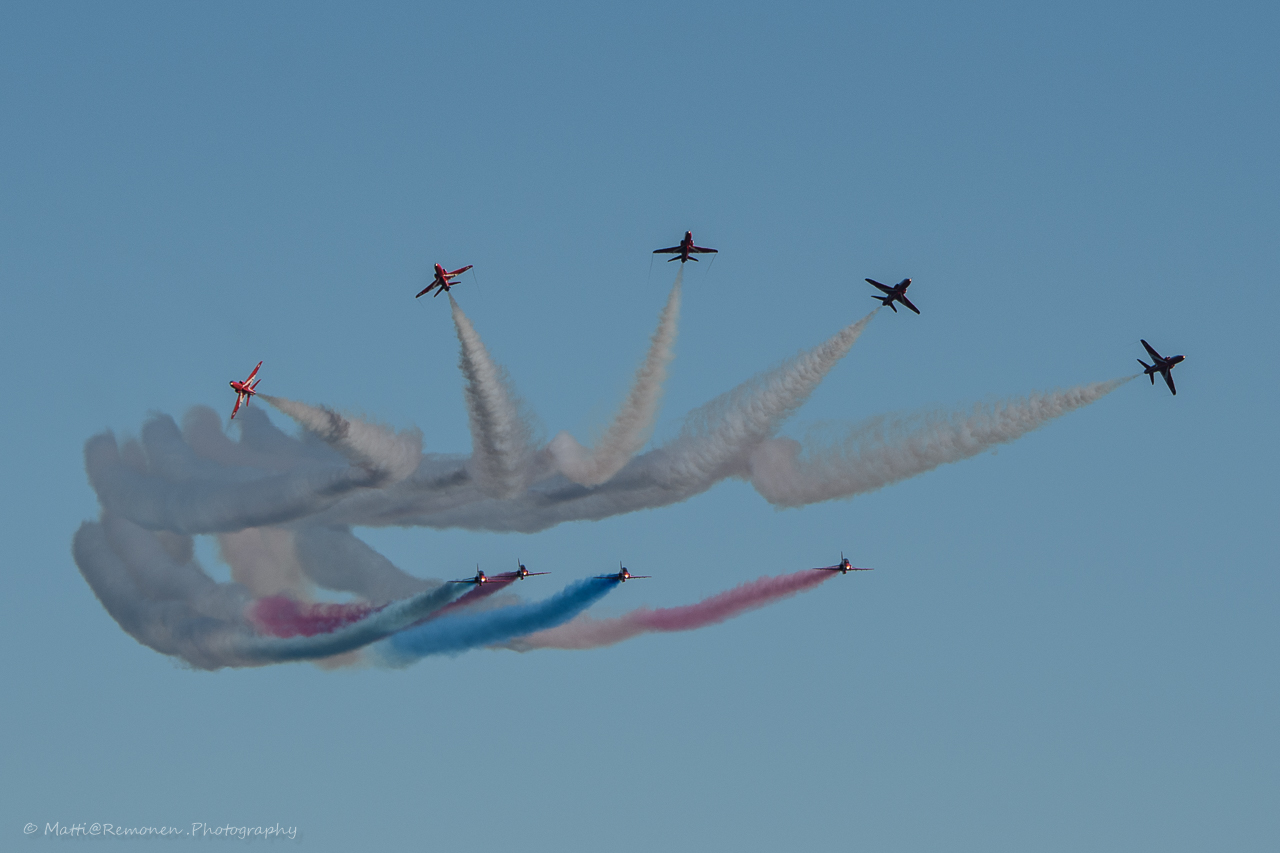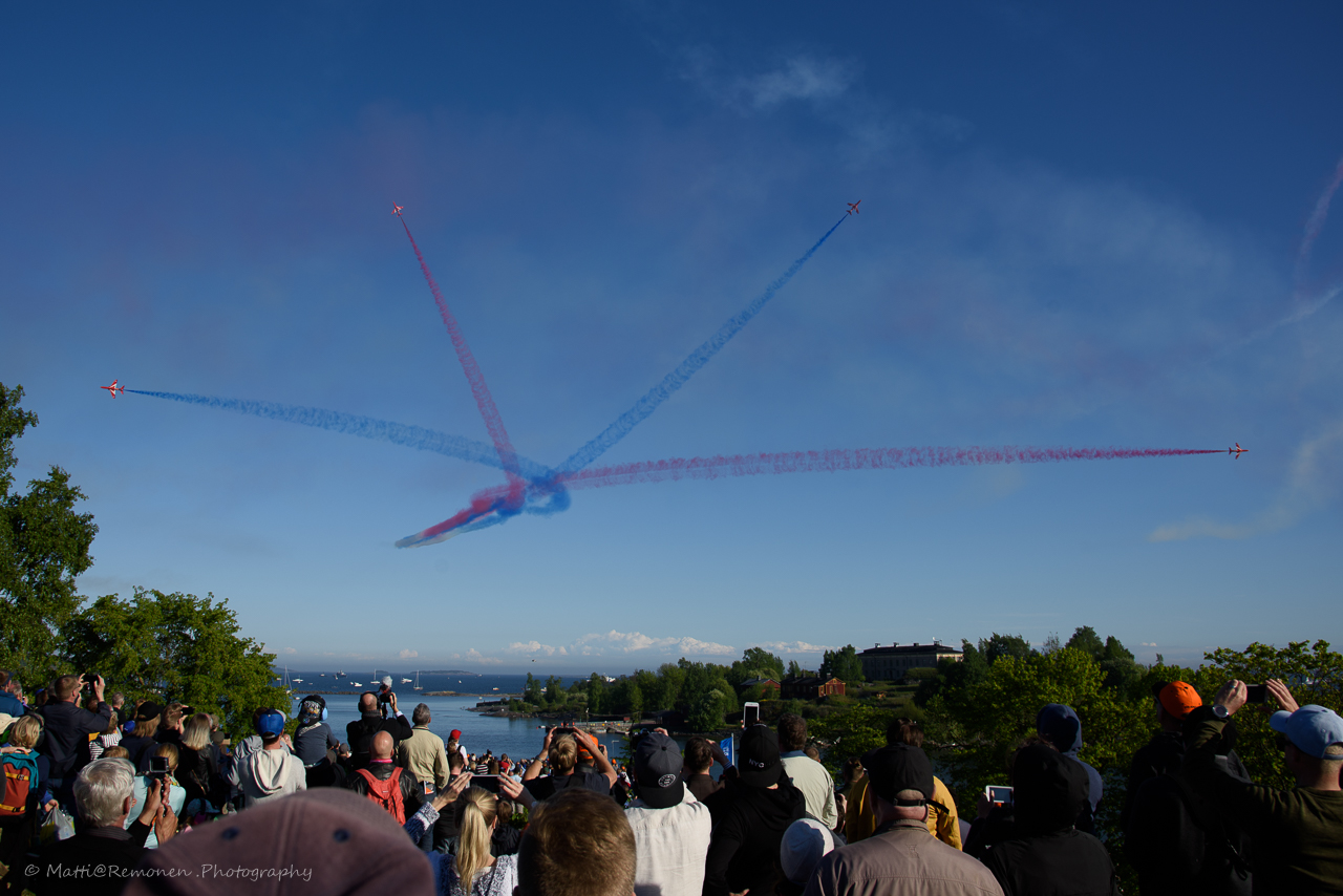 Sen sijaan Brittien taitolentoryhmä Red Arrows tietää, että ensivaikutelman voi anta vain kerran. Yhdeksän koneen muodostelma hiipi hiljaa selän takaa ja sitten ns. kahva eteen.Muutenkin pojista näki, että nyt ei ollut mikään harrastekerho asialla. Taitaa tuon porukan lentotunnit olla enemmän kuin Suomen ilmavoimilla yhteensä.