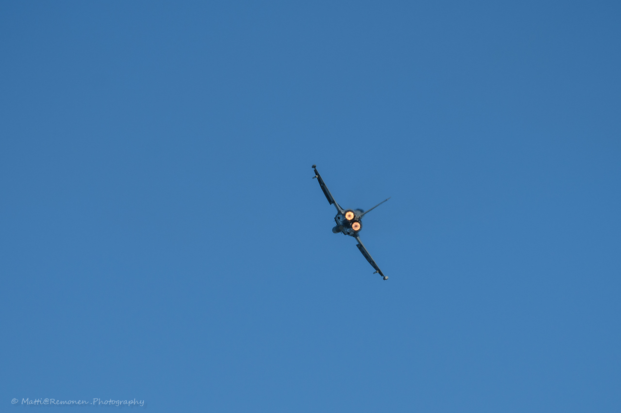 Red Arrowsien show oli jo yksistään tuonne vaivautumisen väärti. Siinä oli sellaista suuren maailman Airshown tuntua. Heidän jälkeensä olikin sitten toisen Suomeen tarjottavan hävittäjäehdokkaan vuoro, eli Eurofighter / Typhoon tuli paikalle. Sielläkin oli ymmärretty, ettei kyse ole mistään pisaralla pisimmälle kisasta. Jälkipoltin oli päällä käytännössä koko ajan ja pintaa vaihdettiin pystysuorilla siirtymillä. Tällä kyllä saa uskottavuutta jo rajojen ulkopuolellakin. Jos sinne ajattelee mennä.