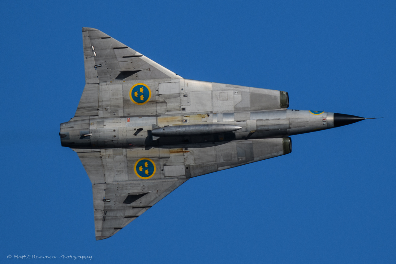 Ranskalaisen visiitin jälkeen paikalle tuli rakkaan länsinaapurimme tuotesortimentti. Ensin hieman vanhempaa Drakenia ja sitten tuoreempaa Gripeniä. Draken kaarteli kuten vanhan leidin kuuluukin, Gripen sen sijaan ryntäili kuin Sedinin veljekset konsanaan. Ihan pätevän tuntuinen tuo Gripen, vaikkei tuota mallia Suomeen ollakaan myymässä, vaan sen seuraajaa.