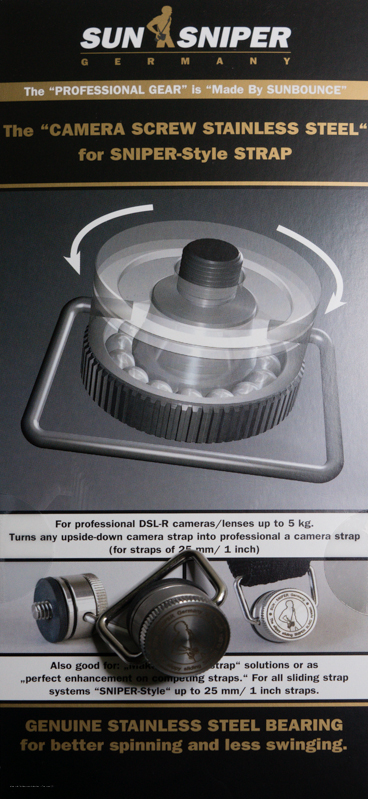 Päätinkin täydentää komboa vielä kameran jalustakierteeseen ruuvattavalla lenkillä, johon saisin jonkun virityksen kiinni. Aikani etsittyäni päädyin saksalaisen Sun Sniper-firman tuotteeseen, joka paitsi että se näyttää siltä että se on tehty kestämään, niin siinä on myös laakerointi estämässä ruuvin aukikiertymistä vaikka kamera pyörisikin kiinnikkeissään. Kun tämä mahtava peukalonpään kokoinen laite oli toimitettu minulle kotiin FedExillä(!), niin ilokseni huomasin, että tähän asti käyttöä vaille jääneet Uni Adaptor-hihnat voidaan hyödyntää tässä yhteydessä. Hihnassahan on sekä uros- että naarasliittimet hihnan päissä, joten sen saa suoraan kiinni Sling Strapin vastaaviin liittimiin.