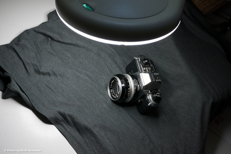 Löinkin siitä kotistudion pystyyn: pyjaman paidasta hieno musta tausta ja kamerarepusta kaivoin ainoan mulla vielä olevan filkkarungon: Nikon FG-20:n, johon laitoin kiinni objektiiviksi Nikonin Ai-S 50/1.4:n. Valoksi sai kelvata työpöydän valaisin, Clas Ohlssonilta ostettu loisteputkivalaisin, sellainen suurennuslasiversio. Ja sitten vain kuvat kamerasta, pientä käsittelyä ja kortit tilaukseen. Otin kaksipuoleiset kortit, joissa toisella puolella on nelivärikuva & tekstit ja toisella puolella mv-kuva ilman mitään tekstejä.