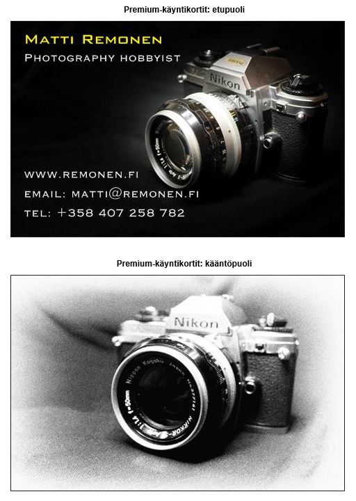 kayntikortit-4Ulkomaisia valokuvausharrastukseen keskittyviä sivustoja lukiessa olen pariinkin otteeseen törmännyt keskusteluihin käyntikorteista. Keskustelu on yleensä mennyt jotenkin sen suuntaisesti, että valokuvaajalla olisi hyvä olla mukanaan käyntikortteja, joista jotenkin selviää, että kuka, mitä ja missä. Siis lähinnä yhteystiedot ja joku valokuvaukseen viittaava nimike, jolla voi perustella miksi on kameran kanssa hääräämässä. Mikään pressikorttihan tuo ei ole, mutta jossain tapauksissa voi helpottaa kuvaustilannetta tai jopa auttaa pääsemään johonkin kuvaukselliseen paikkaan. Ja onhan tuossa se etu, että tarvittaessa yhteystiedot on näppärästi annettavissa, jos nyt joku haluaa sinun ottamasi kuvan itselleen.