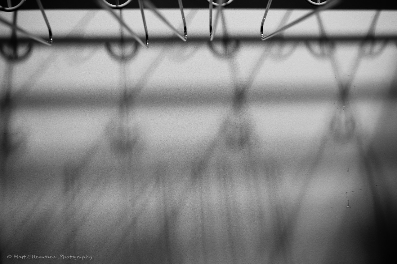 Mutta eihän kuvausmahdollisuutta kannata koskaan roskiin heittää, joten aikan kuluksi sitten kuvailin seiniä ja naulakkoa.