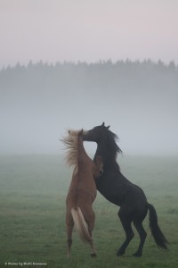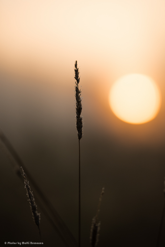 Olosuhteet olivat heti alkuun melko vaikeat: kamera ei jossain vaiheessa meinannut millään tarkentaa laitumella oleviin hepoihin, vaikka välillä manuaalilla auttoikin. Ilmeisesti tuollainen hevonen sumussa on sen verran tasaisesti valaistu, ettei vaihetarkennus tiennyt mihin tarttua. Aikanaan sitten aurinkokin alkoi nousemaan ja paistamaan sumun läpi. Valitettavasti siinä vaiheessa orhit olivat jo purkaneet suurimmat paineensa ja siirtyneet syömään herkullista kasteen kastelemaa heinää.