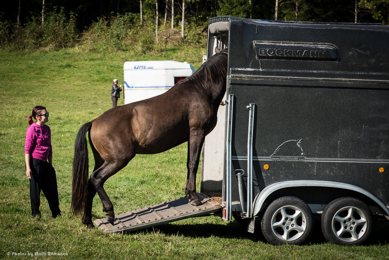Loppujen lopuksi koitti aika, kun omistajat alkoivat saapumaan paikalle hevosenkuljetuskärryineen. Hevoset ilmeisesti tajusivat jotain, sillä ne kokoontuivat kaikki portin eteen ryhmäksi. Vähän niin kuin viiden aikaan tarhan pihalla, kun kaikki lapset roikkuvat portissa odottamassa, että kuka noudetaan ensin. Aika kiltisti hevoset antoivat ottaa itsensä kiinni ja kuljetettavaksi. Kun ajattelee, että ne olivat olleet kolmisen kuukautta täysin vapaana. Tosin sitten se elikon saaminen vaunuun sisälle ei onnistunut kaikilta ihan kuin Strömsössä, mutta sinne ne sitten viimein saatiin.
