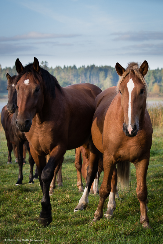 Ypäjän hevoskuvasukurssin seurauksena meillä on ollut FB:ssä oma kurssilaisten ryhmäsivu, jossa on käyty kaikenlaista lähinnä hevoskuvaukseen liittyvää keskustelua ja kuvien jakoa. Siellä oli sitten pari viikkoa sitten ilmoitus mahdollisuudesta lähteä kuvaamaan 2-3 -vuotiaiden orien kesälaitumen päätöstä. Mikäs sen hauskempaa, kuin viettää syksyinen aamuyö laitumen äärellä. Kyseinen laidun sijaitsee Miehikkälässä ja on Kymen-karjalan Hevosjalostusliiton omistuksessa.